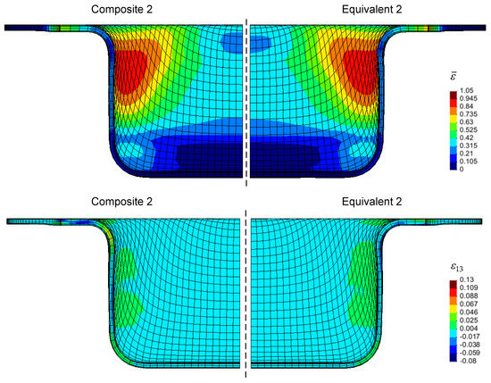 Side view of equivalent plastic strain distributions, , and Green–Lagrange shear strain, , in the Composite 2 and corresponding equivalent material, at the end of the deep drawing process for BHF = 4.9 kN. The maximum values of and are, respectively: 1.024 and 0.121 (for Composite 2); 1.037 and 0.069 (for Equivalent 2).