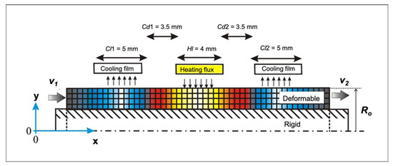 To evaluate the dieless bellows forming process and to verify problems in the dieless bellows forming process, we have developed the finite element model to simulate the dieless bellows forming process by using a finite element method. Figure 3 shows the schematic of an axisymmetric bellows forming model on the FEM carried out on an MSC Marc Mentat version 2005 commercial software from MSC Software USA. A deformable tube and a rigid mandrel are comprised of 5-node, asymmetrically quadrilateral shell elements. We simulate local heating by applying heat flux on the tube surface. The magnitude of heat flux in the induction heating is inversely proportional to the distance from the coil to the workpiece surface. Therefore, Equation (1) is utilized to model various heating when taking into consideration the bellows formation progress already verified in our previous work [5], where q is heating quantity, a is a constant, and y is the position of a node in the y-axis in a global position. qs and a are set to achieve the processing temperature up to 1200 °C. Just before the convolution occurs, the heating quantity is qs; after convolution is formed, the heat flux quantity increases. We model a double cooling system by using film subroutines to reduce the temperature by increasing the heat transfer capacity. Figure 3 shows the geometry of heating and cooling system model referring to the experimental conditions with a 3.5-mm cooling distance (Cd), a 5-mm cooling length (Cl), and a 4-mm heating length (Hl).