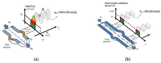 We promote deformation in the semi-dieless bellows forming by adding the compression speed and localized elevated temperature. By assuming that the compression speed driven by the servo motor is stable, we suspect that the cause of deformation instability is variations in the processing temperature. In the real semi-dieless bellows forming process, heating system and cooling system effect to temperature stability. The unstable heating system results from a variety of distances between the heating coil and the workpiece. On the other hand, the unstable cooling is produced by the unstable water cooling. To verify these effects on the semi-dieless forming process, we model a variety of temperatures by varying the quantity of heat flux (qsv (W/mm2)) and heat transfer in the cooling area (hcv (W∙mm−2∙K−1)) as shown in Equations (6) and (7) respectively. Figure 4 shows the schematic of variety of heating and cooling in time series.
