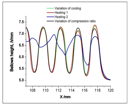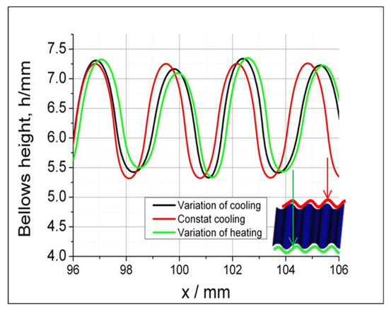 The results of the simulation using the variation of heating and cooling condition produce different bellows profile as shown in Figure 6. Changes in temperature distributions promoted by a variety of heating and cooling affect the bellows profile stability of the bellows pitch and height. We obtain the bellows height by measuring the outer diameter of the bellows profiles. Compared to the constant heating and cooling, various heating and cooling produce various bellows heights and pitches. When a temperature difference occurs in the radial direction, an asymmetric bellows shape is created.