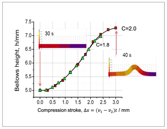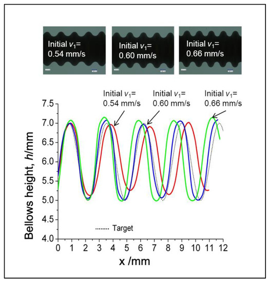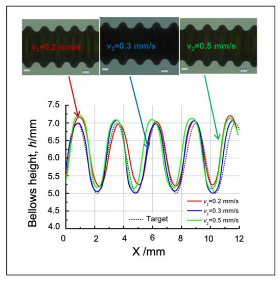 On the other hand, adjustment to the compression speed can effectively and efficiently modify the bellows height. When we use the compression speed to adjust the bellows height, we can obtain a homogeneous bellows height. Figure 9 shows the effects of the compression stroke (since the compression speed is higher than the feeding speed, it significantly affects the bellows height). Therefore, we should adjust the bellows height by adjusting compression stroke (v1 or v2).