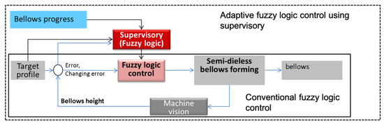 Since the deformation of semi-dieless bellows forming is a free and complex deformation, a feedback control system is a reasonable choice to improve the process and eliminate problems during the process. We have to establish components for the feedback control system such as the deformation reference, the sensing system, and the controller as shown in Figure 11. In the previous work, we had developed a feedback control system for a dieless drawing process by using an adaptive fuzzy logic control [16]. However, in this work, the difference lies in deciding on the deformation target of the bellows profile and selecting the fuzzy control parameters to obtain the best results. Since the deformation characteristic of semi-dieless bellows forming is different from that of the previous work, we have to decide on another control strategy.