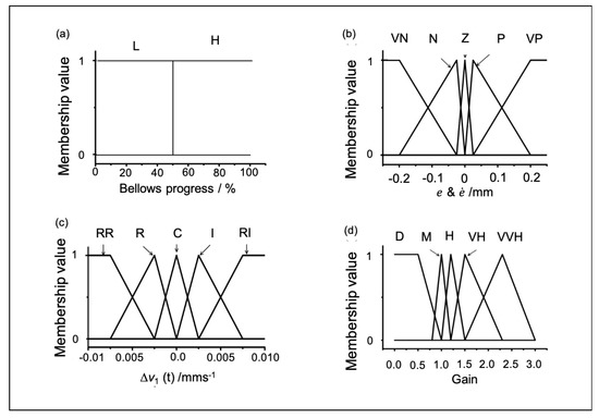 Membership functions of conventional fuzzy controller: (a) bellows formation progress consist of two membership function L (Low), H (High), (b) bellows height error and changing rate of the error has similar membership function VN (Very Negative), N ( Negative), Z (Zero), P (Positive), VP (Very Positive), (c) incremental compression speed (∆v1) consist of membership function RR (Rapid Reduce ), R (Reduce), C (constant), I (Increase), RI (Rapid Increase), and (d) gain consist of membership function D (Decrease), M (Medium), H (High), VH (Very High), and VVH (Very Very High).