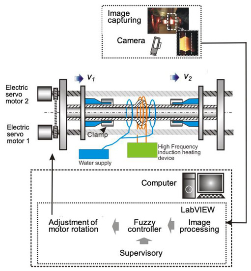 The Vision based fuzzy controller is implemented in the horizontal semi-dieless compression machine, a computer for implementing the fuzzy rule, control speed of two servo motors. The machine is equipped with an induction heating source, as shown in Figure 13. The compression speed v1 and feeding speed v2 of the specimen is controlled by rotation of ball screw from servo motor. A narrow heating area is achieved with a high-frequency induction heating apparatus using a 4-mm induction coil width (Hl). A water-cooling system is applied to maintain a constant temperature distribution with a 7.5-mm cooling distance (Cd). The image acquisition system using a commercial CCD camera to grab the image up to 30 fps. The image of bellows progress is transferred to image processing unit. The fuzzy algorithm is designed to adapt with bellows formation progress. Image processing unit and fuzzy logic controller is construct under platform of LabVIEW software. The output obtained by the fuzzy inference is an input to the servo motors to adjust the compression speed of v2.