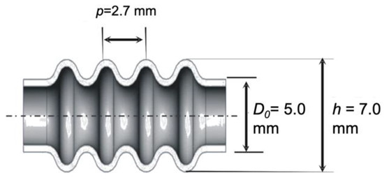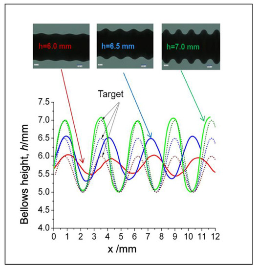In the case of the bellows target shape shown in Figure 14, the bellows shape parameters in the x domain must be converted to that of the time domain where the original diameter, D0 is 5 mm and the maximum bellows diameter is 7 mm. After transformed into Equation (8), the amplitude, A, will amount to 1 mm. Pursuant to a previous study, the pitch distance between the convolutions on these processing conditions are fixed at 2.7 mm [4,5].