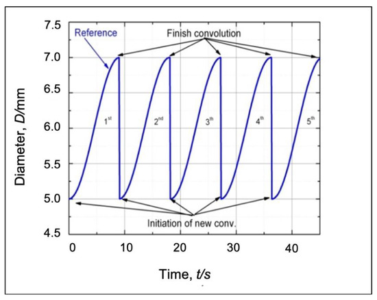 In the real bellows geometry, the outer diameter of the bellows target shape is a function of the x domain (D (x)). In the real-time monitoring, the control program is run under a time series. Therefore, it is necessary to construct a diameter reference in the time domain. According to the sequence of bellows formation that we had obtained by employing a FEM from our previous work, bellows formation is a cyclic process. A series of bellows height has a specific period as shown in Figure 10.