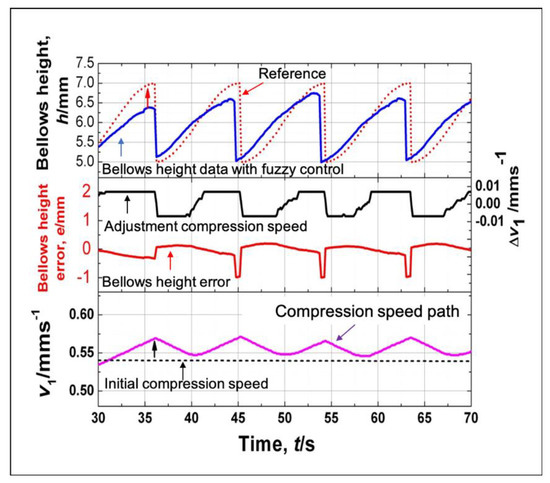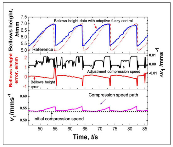 Figure 16 and Figure 17 show history of the compression speed paths, the bellows error, the adjustment compression speed (Δv1) and the bellows height obtained from the conventional fuzzy and the adaptive fuzzy control respectively. The speed path using a conventional fuzzy is obtained from the adjustment of the initial compression speed according to the error and the changing error condition following the fuzzy rules. This adjustment does not take into considerations the bellows formation progress. The fuzzy control adjusts the compression speed by only taking into considerations the bellows height error from the reference and the actual bellows height. Adjustment of the compression speed follows the fuzzy rules as shown in Table 1. The history of the bellows height produced by using a conventional fuzzy control shows little agreement with the deformation reference and little agreement with the bellows height. It results from the deformation delay in the semi-dieless bellows forming process. The adjustment results of the compression speed in the beginning of the bellows formation will affect the middle-end bellows formation. In the beginning of the bellows formation, the error is always positive. Therefore, the fuzzy reduces the compression speed. The decreased compression speed reduces the compression stroke that decreases the bellows growth and that approaches the deformation reference. When the history of the bellows height is lower than that in the deformation reference, the fuzzy increases the compression speed. However, due to the delay process and the limited bellows formation timing (10 s), the increased compression speed is not capable of achieving the desired bellows height target before it moves to the cooling zone.
