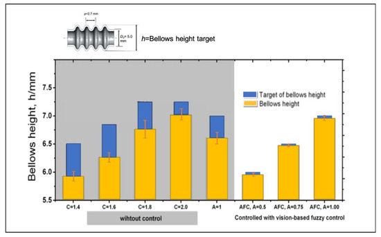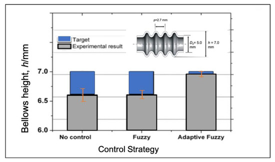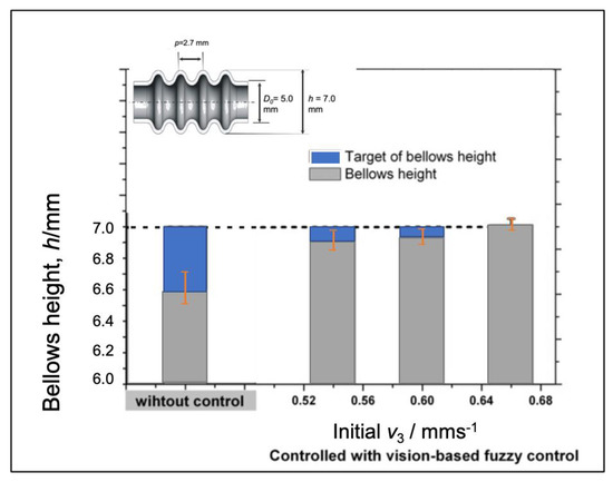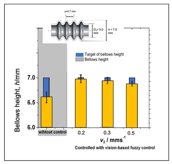 The vision-based with adaptive fuzzy control performs good agreement with the bellows height target with low variations as shown in Figure 18. It is shows that the compensation based on progress of bellows formation is effective on adjusting bellows progress with low standard deviation. According to FE analysis, bellows height formation can be adjusted effectively after bellows initiation is produce. Adjustment of the compression speed is effective when it is applied to over half of the bellows progress as it has been proven in the FEA. To verify the reliability of the vision-based adaptive fuzzy control system, several experiments have been conducted with different processing conditions such as various feeding speeds, various bellows height targets, and various initial compression ratios.