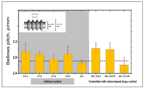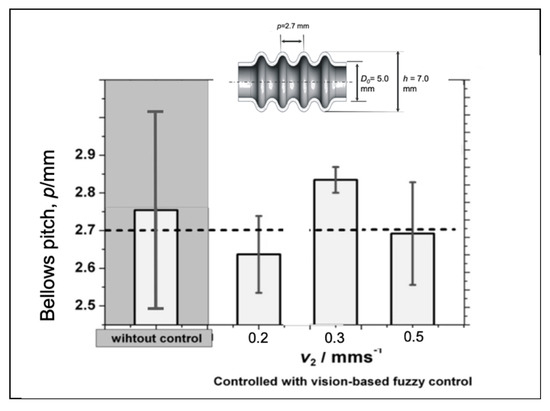 Making the evaluation on the larger area, we find out that the accuracy of the bellows height will slightly decrease when the processing speed increases as shown in Figure 26 probably since the time to produce one convolution (5 s) is short, so it makes the effectiveness of the vision-based fuzzy control decrease. We can enhance the effectiveness of the adaptive fuzzy by considering the processing speed to adjust the fuzzy parameters such as modifying a membership function span and the adaptive fuzzy to rule at a higher processing speed. Figure 27 shows the evaluation of the bellows pitch that shows different accuracies. However, for a variety of the bellows pitch, the utilization of the proposed control system has produced a lower variation that increases reproducibility.
