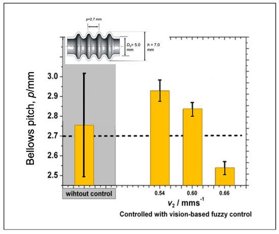 Performance of vision-based adaptive fuzzy control under different initial feeding speed can be seen in Figure 20. All conditions correspond to the target of bellows height. For low speeds, the bellows height tends to be slightly lower than the target height. For high initial compression speeds, the bellows tend to be more elevated than the target even if we apply the adaptive fuzzy to adjust delta v1 in accordance with the error and changing error. Since the adaptive fuzzy is only adjusted for each bellows formation, when one bellows formation is finished, it will be back to the initial feeding speed. Therefore, the initial compression speed is essential and can be changed using a fuzzy. If the bellows height is below the target, the fuzzy will increase the initial feeding speed and the other way around. Figure 21 shows the evaluation of bellows pitch at different initial compression speeds. Even though it produces low accuracy, the proposed control system delivers lower variations compared to that of the conventional approach due to the fact that each bellows formation is a guide that makes every bellows formation more homogeneous.