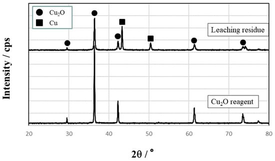 XRD peaks of leaching residue and Cu2O reagent. Leaching conditions; 1 mol/L sulfuric acid without aeration, 50 °C, 400 rpm, 2% pulp density [23].