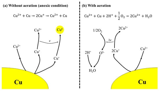 The proposed concept of leaching behavior of copper from Cu metal by Cu2+ ions in sulfuric acid leaching: (a) without aeration and (b) with aeration.
