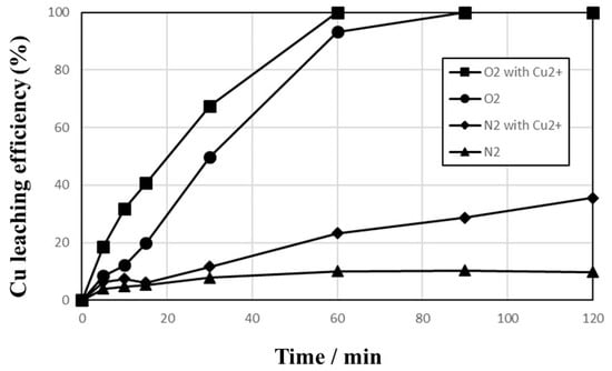 Equation (7) indicates that the combination of Cu2+ ions and O2 could leach the Cu2+ ions from copper metal. However, the effects of the addition of the Cu2+ ions and introduction of oxygen on the enhancement of copper leaching have not been investigated in a sulfuric acid solution. Since oxygen has a relatively high standard redox potential to oxidize copper metal (O2 + 2H2O + 4e− = 4OH−, + 0.40 V) [13], only O2 can oxidize copper and has been used in de-copperization from the anode slime. Therefore, in this study, four experimental conditions were compared to investigate the oxidation of copper metal powder in the sulfuric acid solution. These conditions were as follows: the addition of Cu2+ ions with the introduction of O2, the addition of Cu2+ ions with the introduction of N2, the introduction of O2 without the addition of Cu2+ ions, and the introduction of N2 without the addition of Cu2+ ions. Thus, the synergistic effect produced by using the Cu2+ ions and O2 was investigated for copper metal leaching.
