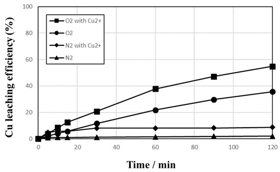 In Equations (5)–(7), the Cu+ ions play a key role as an intermediate. However, it is difficult to detect the Cu+ ions in the sulfuric acid solution due to their instability. Therefore, the improvement in copper metal leaching was verified experimentally in sulfuric acid solution by adding the Cu2+ ions and introducing O2. Four leaching conditions were used according to the addition of the Cu2+ ions and introduction of O2, and the leaching behavior of Cu from Cu metal was investigated.