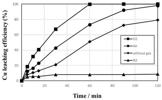 Effects of the introduction of gases on the leaching behaviors of Cu in 1 mol/L sulfuric acid solution at 400 rpm with 1% pulp density, ≤75 µm Cu powder, and 10,000 mg/L Cu2+ ions.