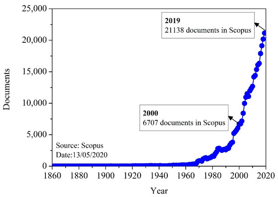 Over recent decades, many products and solutions based on cellular metals [5,6,7,8,9,10,11,12,13,14,15,16,17,18] have been developed combined with other light materials like advanced high strength steels, light metals [19,20], polymers [21,22,23,24,25,26,27] and carbon nanostructures (e.g., carbon fibers) [28]. For example, cellular solids are used and/or tested as filler [29,30,31,32] and cores [33,34] of thin-walled structures and sandwich panels for buildings, industrial machines, cars, trains, and aircrafts. Their use contributes to an immediate weight reduction and material savings of the components, but also to perform multiple functions due to their 3D porous cellular structures (open-or-closed-cells) [35]. The open- and closed-cell structures are used as functional materials (e.g., electrodes, heat exchangers, and biomedical implants) and structural materials (e.g., impact/crash energy absorbers in vehicles, antivibration dampers), respectively [1,2]. The field of cellular materials has significantly increased over the last decades, which is reflected in the growth of published literature (Figure 1). Several cellular metals have been emerging due to two main reasons. The first reason is the need to create cellular structures with high structural efficiency and capacity to absorb both impact and damping noise and vibration. The second reason is the need to create periodic cellular structures with an easily reproducible unit cell to achieve predefined performances, establishing the process–structure–property relationships. Recent developments include composite and nanocomposite metal foams [28], lattices [36,37], 3D printed structures [38], syntactic foams [26,29,39], hollow sphere structures [27], auxetic materials [40,41,42], and hybrid structures [22,23,24,25,43] (e.g., filled hollow structures and sandwich panels). The latter often leads to the introduction of new technologies (e.g., 3D additive manufacturing) and products.