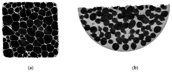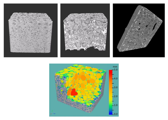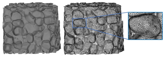 The μCT is also used together with finite element modelling [52,53] to develop the numerical models to describe and predict different process parameters and the mechanical, acoustic, and thermal behavior of the cellular materials, studying the different geometrical parameters. Finite element method (FEM) models can help to select the best microstructure for a given property (then for a given application) without the traditional, complex, time consuming, and labor-intensive experimental tests. The μCT scanned images are reconstructed using algorithms (e.g., filtering and smoothing) and software like NRecon (Bruker, Belgium). The μCT scanned images are used to create FEM meshes (Figure 6).