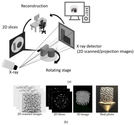 The equipment is composed of an X-ray source, a motor controlling rotating stage (where the specimen is mounted) and a detector (Figure 3a). The specimen is mounted between the X-ray source and the detector panel and projections are taken after each degree of rotation. Flat panel is an example of a commercial detector which is composed by an array of discrete sensors arranged as a matrix. The response of each sensor is proportional to the radiation energy that reaches its surface and is captured. The capture of data from each discrete part produces a 2D projection/scanned image (Figure 3a) that is converted into a digital image and, thus, is immediately visualized on a computer.