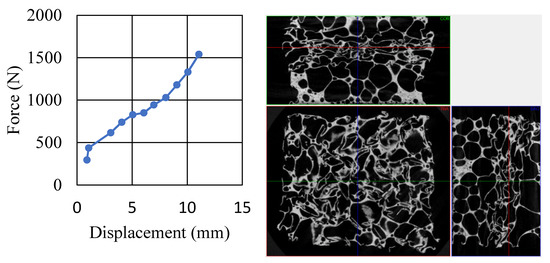Force–displacement curve, showing the three orthogonal reconstructed slices (from Bruker’s Data Viewer software [51]) of a closed-cell foam (cross section: 15 mm × 15 mm).