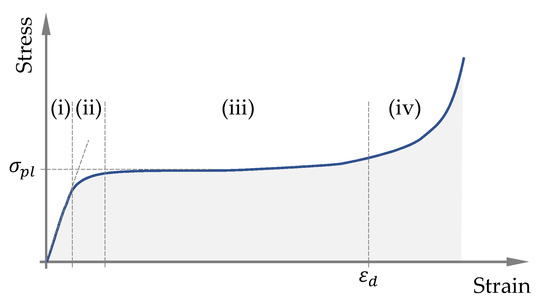 The most frequently applied experimental method for cellular metals is the uniaxial compressive test [56,57,58,59] because: (i) cellular metals are in applications often subjected to compressive loading and (ii) this type of test is straightforward, cost-effective and has minimum time requirements (short preparation time). From the compressive tests, the force-displacement (engineering/true stress–strain) diagrams can be obtained via load cells (or additional sensors) and the deformation behavior by visual capturing. Regardless of the type of the cellular metal, porosity or relative density (influences the elastic modulus, plastic strength, and energy absorption [60], base material, topology, and morphology (e.g., cell size effect [61], graded porosity [62]), a characteristic compressive behavior can be observed (Figure 7), which can be distributed in four main sections. Quasi-linear response (i) represents the initial stiffness of the cellular metal and is followed by transition zone (ii), where the cellular structure constituents (cell walls and struts) start to compress, bend, or stretch, resulting in local yielding. After additional loading, the stress–strain curve flattens into the stress plateau (iii). The stress is kept almost constant due to bending, buckling, stretching, and crushing of the cellular structure up to densification (iv), where the stiffness increases and approaches the base material properties at full compaction. The most important mechanical properties are initial stiffness, stress plateau (in cellular metal literature also sometimes referred to as yield stress, yield strength), densification strain , and energy absorption capacity (grey area under the stress–strain curve).