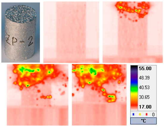 It is a full field method and the temperature image can be processed as a thermal gradient image [97], giving information about direction of thermal change. Thus, from a single thermal image it can be concluded what is happening with a specimen (Figure 8). The example in Figure 8 shows the case of dynamical compression of a syntactic aluminum specimen (diameter: 26.9 mm; height: 43.2 mm). Infrared images are showing the specimen’s surface, where generated heat is representing energy dissipated during compression process and, thus, the source of plastic deformation and collapse. IR camera acquisition rate was 489 Hz. IR images present specimen’s deformation at a strain increment of approximately 10%.