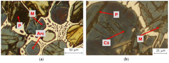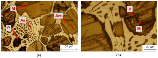 The microconstituents that can be present in the alloy are proeutectic austenite (APE), martensite (M), pearlite (P), secondary carbides (CS), eutectic carbide (CE), and eutectic (E) [10]. Contrary to other ferrous alloys, in Ni-hard works, it is not common to distinguish between pearlites and bainites because they show almost the same pernicious properties, so the term “pearlite” actually refers to any biphasic aggregate that comes from the diffusive decomposition of the austenite in ferrite and cementite. However, many structures are distinguished as the decomposition temperature—as well as the thickness of these lamellas—is lowered: pearlite, sorbite, troostite, upper bainite, and lower bainite [1,16]. Generally, the thinner the lamellas are, the more resistant and brittle the biphasic constituent is. Though there are plenty of possibilities among the etchants to identify the microconstituents of these alloys, the selected attacks are focused on unequivocally highlight any of them.