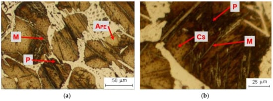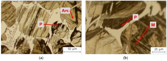 For these attacks, etchants, reaction times, and temperatures were chosen according to specialized studies [1,5,26,43,44]. The key point is to minimize the etching time and the temperature not to burn the microstructure. This would induce the darkening of the microconstituent instead of its identification. It is preferable to accomplish a series of short attacks, checking the results after each one, instead of attacking the sample for long.