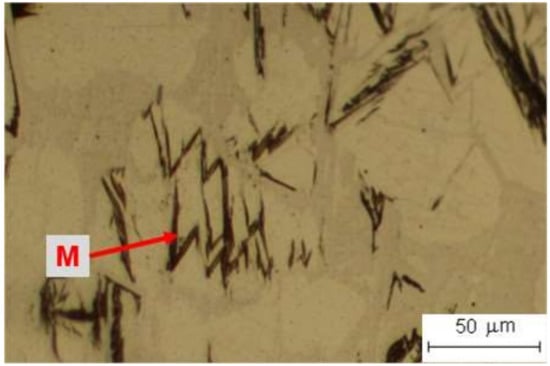 The Vilella reagent hardly attacks the phases of the white cast. There is a black-colored phase corresponding to martensite with their characteristic morphology in needles, forming 60° between them. Areas with a darker hue are also observed, which corresponds to the matrix of eutectic carbides (Figure 12).