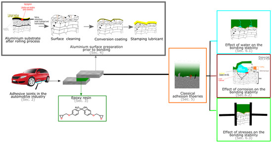 All structural adhesives are cross-linked. The best known and most widely used structural adhesives are epoxies. A schematic representation of this review outline is shown in Figure 1. In the first part, the use of adhesive joints in automotive is introduced. Then, the chemical characteristics of the epoxy adhesives will be described. However, it must be noticed that epoxies are only one, even if widely applied, of the broad class of adhesives that can used in a vehicle. A factor of pivotal importance for the long term durability of the joint is the chemistry of the substrate’s surface prior to bonding. In order to be used for bonding, in most cases the aluminium substrates is pre-treated. Different pre-treatments can be applied on the surface and the different methods will be mentioned in the successive sections. Section 5 will then briefly discuss the classical theories of adhesion. In fact, there have been different attempts in the past to develop a single theory which could explain how adhesion can occur. Finally, the focus will be on the durability of the adhesive joints and some of the extensive literature on the effect of moisture, corrosion and stress on the adhesive joints will be analyzed.