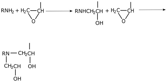 Amines are important curing agents for epoxy resin. They provide fast cures with a relatively high crosslink density. Usually primary amines are used for curing and these can be aromatic, cycloaliphatic or aliphatic. A primary amine has two active hydrogens which are capable of reacting with an epoxy group. Most of the primary amine curing agents that are used have more than one primary amine per molecule so that the crosslinking and, therefore, network development can occur. A secondary amine will react with only one epoxy group. The secondary amines are derived from the reaction product of primary amines and epoxies. They have rates of reactivity and crosslinking characteristics that are different from those of primary amines. The secondary amines are generally more reactive towards the epoxy group than the primary amines, because they are stronger bases. They do not always react first, however, due to steric hindrance. If they do react, they form tertiary amines. In contrast, tertiary amines which have no active hydrogens, will not react with epoxy resins but can cure epoxy resins catalytically, resulting in homopolymerization. Figure 4 shows the reaction between an epoxy and a primary or secondary aliphatic amine [14,17].