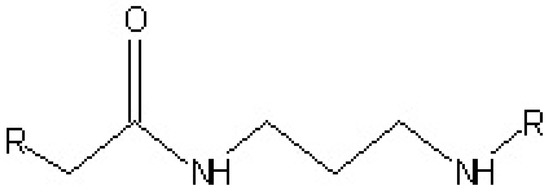 This class of curing agents (Figure 5) are made from dimerized unsaturated fatty acid and they are derived from the reaction of the dimer acid with a polyamine. Their reaction with the epoxy resins is through the amine groups and not the amide hydrogens. The presence of a polyamide backbone gives an overall good mechanical property to the polyamide amine cured adhesives. Cure times can last to several hours at room temperature to few minutes at 150 °C [18].