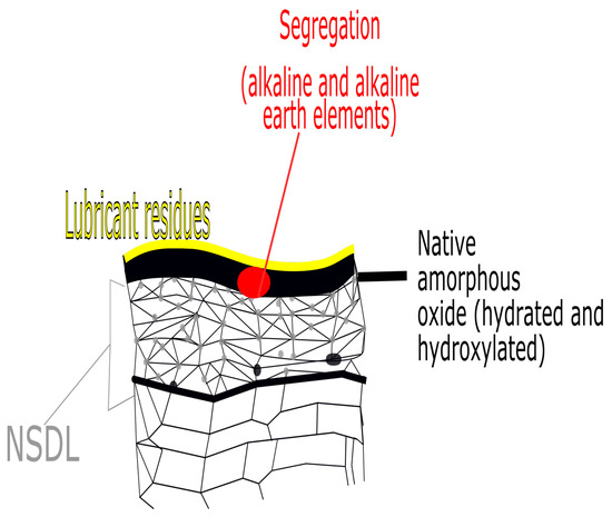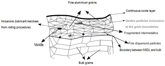 Aluminium is a very reactive metal with a high affinity for oxygen. Therefore, when exposed to air it will instantaneously form a thin oxide. If the oxide is formed at low temperature (below about 375 °C) it is composed of a thin amorphous Al2O3 about 1–2 nm which is adjacent to the metal with hydrated surfaces oxides and hydroxides on top. The hydrated overlayer is usually composed of hydrated gel-like pseudoboehmite (AlOOH), crystalline boehmite and/or trihydroxides Al(OH)3, bayerite, or gibbsite depending on how much they were exposed to humidity and for how long. The total thickness can be between 2 and 60 nm [29]. Aluminium hydroxides are considered basic and therefore good for interaction with acid polar sites of polymers (as explained later in the acid-base theory). However, hydration (as opposed to hydroxylation) may reduce the overall adhesion performance as it creates weaker basic sites on the top surface. Oxidation and hydration can also be accelerated by the presence of alkaline and alkaline earth elements (such as Li, Na, and Mg) segregated at the surface or at the metal-metal oxide interface [30]. In particular, in case of heat treatment, Mg migrates at elevated temperatures depending on what is the initial Mg bulk concentration and the bulk Al grain size. Even if Mg oxide is basic, unlike Al2O3, it dissolves easily in neutral humid enviroments [31]. In case of heat treatment at higher temperatures (>400 °C) the amorphous oxide may crack due to thermal expansion and nuclei of crystalline -Al2O3 can be formed. If the enucleation of crystalline alumina lead to the loss of cohesion of the oxide with the metal substrate then it may have a detrimental effect on the total adhesion [32,33]. The presence of Mg also promotes the crystalline oxide growth as it acts as a nucleant for -Al2O3. Different heat treatments conditions and Mg content can form different oxides on the top surface such as MgO, Al2MgO4 or Mg doped Al2O3 [32]. Therefore, in Mg rich alloys more complex oxides can be formed. Another characteristic of the alumninium substrate after rolling is the so-called near surface deformed layer (NSDL). When the roll is biting the surface, it can initiate cracks in the oxide of the metal. During the exit of the roll, mill metal or intermetallics can stick to the roll surface and can be picked up by the roll. In successive rolling cycles, these particles are re-depositing on the surface and they can create more imperfections or they can initiate cracks in the oxide layer. Oxides are then lift up by the roll and can be redeposited on other areas of the surface [34]. These properties create a layer on the surface of the aluminium which is different from the underlying bulk [35,36,37,38,39]. This layer is known as the near-surface deformed layer. In their work Fishkis and Lin [35], studied a non-heat treatable aluminium alloy containing magnesium which has undergone different stages of hot rolling. By using a combination of wavelength-dispersive X-ray spectroscopy (WDS) and transmission electron microscopy (TEM), they could observe the different characteristics of the NSDL which are summarized in Figure 9.