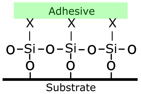 Among coupling agents, silanes are used the most. The role of coupling agents is to improve the degree of cross-linking in the interface region to obtain an improved chemical bonding. The functionality of the silane can interact to form chemical bonds with both the substrate and the adhesive. Silanes coupling agents have the form R−SiX3, where R is an organic functional group and X is the hydrolysable group [26]. An example of how the silane is binding with the metal, with the formation of a covalent bond, is shown in Figure 10. The advantage of silanes is that they are simple and stable, mostly due to their covalent cross-linked structure [60]. Moreover, in addition to covalent bonding, other factors which have been proposed for the effectiveness of silanes include the improvement in surface wettability and the capacity of silane layers to be deformable and relieve internal stresses [61]. However, among the drawbacks of the use of silanes is their difficult to be stored which leads to a relatively short shelf-life [62]. Organophosphonic –acid based coatings have been used as well as coupling agents due to their excellent properties. It has been shown that organophosphonic acids form very stable monolayers on aluminium alloys covered with a thin oxide film [63,64,65,66,67]. It was seen that the presence of phosphonate monolayers enhances the adhesion with the aluminium oxide [68]. Moreover, having a bi-functionality enables the binding of the phosphonic acid or its anion to the oxide surface while the other group can react with the organic phase of the adhesive or coating [69]. Organophosphonic acids can be applied on the surface via dip coating or spraying [70].
