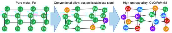 High-entropy alloys (HEAs) have recently become a subject of extensive research because they are expected to be used in applications such as molds, tools, and functional coatings [1,2]. Unlike traditional alloys, HEAs are composed of at least five major elements with concentrations in the range 5–35 at% [2]. Surprisingly, the large number of components contained in HEAs does not lead to the formation of the intermetallic phase expected on the basis of a ternary phase diagram. Rather, single-phase solid solutions are preferentially formed. Despite being a single-phase solid solution, a HEA contains more elements than conventional alloys such as austenitic stainless steel, as shown in Figure 1. Therefore, HEAs exhibit severe lattice distortion. Nevertheless, because of their simple microstructure, HEAs possess a unique combination of properties not found in traditional metallic materials, such as high strength at elevated temperatures, ductility, and corrosion resistance [3,4,5].