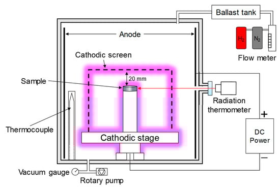 Nitriding was carried out in a plasma nitriding device (JIN-1S, NDK Inc., Kanagawa, Japan). Figure 2 shows a schematic of the plasma nitriding process. An auxiliary screen and samples were placed on the cathodic sample stage. As a result, plasma was formed on both the sample and the auxiliary cathode screen. This auxiliary screen suppresses the edge effect by increasing the supply of active species such as N+, N2+, and H+ and heating the sample surface uniformly [45,46,47,48,49]. The auxiliary screen material was an expanded mesh of AISI316L austenitic stainless steel (ASS) with 38% open area, a diameter of 200 mm, and a height 70 mm. The distance between the sample and the screen was approximately 20 mm. After the chamber was evacuated to approximately 10 Pa, N2 and H2 flowed into the chamber and a direct-current voltage was applied. Plasma nitriding was carried out for 15 h at 673–773 K under a 25% N2–75% H2 atmosphere with a pressure of 200 Pa. After nitriding was completed, the samples were cooled in the furnace.