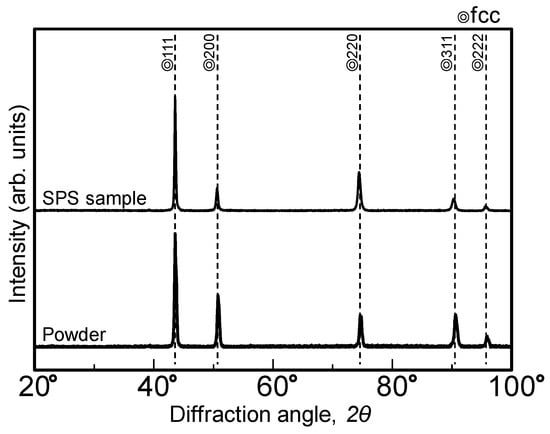 In the present work, an HEA was fabricated using the spark plasma sintering (SPS) process of PM. This method generates high temperatures at the powder-contact region via a large applied pulse current. This high energy is used to promote sintering. In contrast to traditional metallurgy, PM offers numerous advantages, including excellent material efficiency and geometric complexity. In addition, SPS can suppress grain growth by rapid heating and rapidly consolidate powders at high densities within a short time. The usefulness of SPS has recently been demonstrated in functional materials, metal/ceramic nanomaterials, hard materials, and composites systems [18,19,20]. Various HEAs have also been produced by the SPS method [21,22,23,24,25].