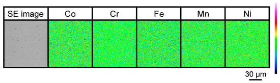 SE image and electron-probe microanalysis (EPMA) elemental mapping images of Co, Cr, Fe, Mn, and Ni for the SPS sample sintered for 10 min at 1173 K.