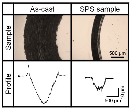 Wear track and its cross-sectional profile for as-cast and SPS CoCrFeMnNi samples.