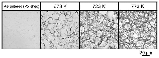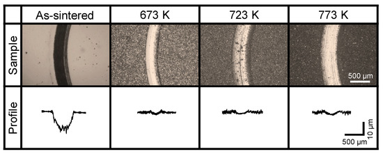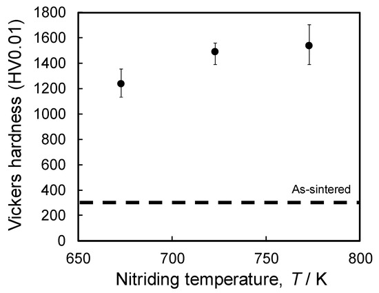 Figure 11 shows the results of the surface hardness tests after plasma nitriding. The hardness of all of the plasma-nitrided samples was greater than that of the as-sintered sample. Their hardness increased with increasing nitriding temperature, and a hardness of 1500 HV was observed for the sample nitrided at 773 K. This increase in surface hardness is explained by the formation of the expanded fcc phase at 673 K or the NaCl-type solid solution at temperatures greater than 723 K because of N diffusion induced by plasma nitriding [42], as shown in Figure 8 and Figure 9.