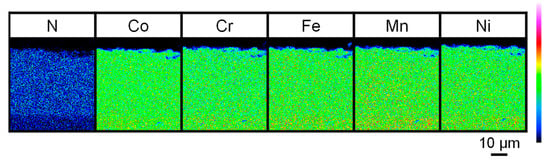 EPMA element mapping images of N, Co, Cr, Fe, Mn, and Ni for CoCrFeMnNi samples plasma-nitrided for 15 h at 773 K.