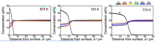 The surface morphologies of the HEA samples after plasma nitriding are shown in Figure 7. Grain boundaries are clearly visible on each plasma-nitrided surface. The soluting of N atoms into the HEA lattice obviously induced a large lattice expansion; this phenomenon has also been observed on the surface of ASS after plasma nitriding [56]. Figure 8 shows the cross-sectional EPMA element mapping images for the N, Co, Cr, Fe, Mn, and Ni of the plasma-nitrided samples. N enrichment was clearly observed in the surface region in the EPMA element maps. The diffusion of N into the sample was observed under all of the investigated nitriding temperatures. GD-OES profiles of the samples plasma-nitrided at temperatures from 673 to 773 K are shown in Figure 9. The profiles show a surface area comprising of a layer rich in N. Moreover, higher nitriding temperatures led to deeper N diffusion. The N-enriched region at the surface is considered to be the compound layer, and the graded region below this layer is the diffusion layer. The constituent elements in the nitriding layer of the HEAs were approximately the same. Such elemental distributions correspond to the EPMA element mapping images (Figure 8).