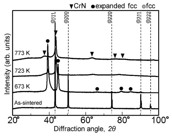XRD patterns of the samples plasma-nitrided at temperatures between 673 and 773 K are shown in Figure 10. The pattern of the HEA sample plasma-nitrided at 673 K shows an expanded fcc phase whose peaks are shifted to lower angles compared with those in the pattern of the as-sintered HEA sample. This pattern supports an expanded fcc phase with a supersaturated N solid solution with an fcc structure. The pattern of the HEA sample plasma-nitrided at 773 K indicates the presence of the CrN phase. Expanded fcc and CrN phases have previously been observed in cast CoCrFeMnNi HEAs after gas-nitrocarburizing or plasma nitriding [33,42]. The same tendency has been reported for plasma nitriding of ASS. The expanded fcc phase, referred to as the expanded austenite or S-phase, has been previously identified at <723 K in plasma-nitrided ASS [57,58]. We concluded from the aforementioned results that the expanded fcc layer is formed on the HEA sample surface plasma-nitrided at 673 K. In contrast, at nitriding temperatures greater than 723 K, a broad CrN phase is identified by XRD and N enrichment is indicated by EPMA and GD-OES. We inferred that an NaCl-type homogeneous solid solution such as (Co,Cr,Fe,Mn,Ni)N is formed as a nitriding layer on the HEA surface [42].