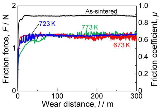 Figure 12 and Figure 13 show the results of the tribology tests. Figure 12 shows that the plasma-nitrided samples exhibited a lower coefficient of friction than the as-sintered substrate. The coefficient of friction reached approximately 0.66 irrespective of the nitriding temperature. Furthermore, the variation amplitude of the coefficient of friction of the plasma-nitrided samples was larger than that of the as-sintered sample. These large variation amplitudes of the coefficient of friction were caused by the wear debris with a higher hardness during the wear testing [59]. Wear tracks and profiles of sections after the ball-on-disk test are shown in Figure 13. The wear track and profile of the as-sintered sample indicate poor wear resistance. The wear tracks and profiles of the plasma-nitrided samples indicate substantially less wear than observed for the as-sintered sample. This superior wear resistance is attributed to the high hardness and low coefficient of friction of the nitrided samples.