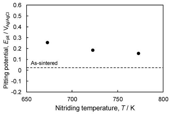 The results of pitting corrosion tests of plasma-nitrided samples using a corrosive aqueous solution of 3.5 mass% NaCl are shown in Figure 14. The pitting potential of the plasma-nitrided samples was higher than that for the as-sintered sample. The pitting potential decreased with increasing nitriding temperature. Some authors have reported that the S-phase that forms on ASS suppresses pitting corrosion in solutions containing chloride ions [38,57,60]. N in ASS is believed to dissolve into solution when the steel is exposed to corrosive media. These N atoms react with H+ in the pits to form NH4+. This reaction increases the local pH and promotes repassivation [57,60]. Due to the nitrides formed on HEA samples, a similar mechanism may have occurred, resulting in improved pitting corrosion resistance. By contrast, in the case samples nitrided at temperatures greater than 723 K, HEAs and ASS tended to differ. The plasma-nitrided HEAs have higher pitting potentials than the as-sintered sample, whereas the plasma-nitrided stainless steels exhibited lower pitting potentials. We attributed these results to the effect of the Cr concentration in the base metal. In the case of ASS, the formation of CrN and the depletion of Cr in the S-phase reduce the pitting corrosion resistance [61]. However, the HEA used in the present study has a higher Cr concentration than ASS, so Cr is not depleted. The aforementioned results show that the formation of expanded fcc or (Co,Cr,Fe,Mn,Ni)N results in high hardness, superior wear resistance, and enhanced pitting corrosion resistance.