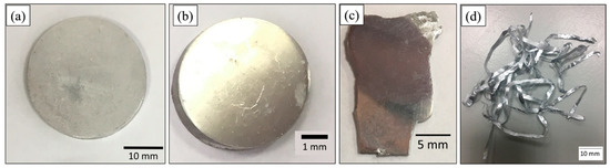 In order to obtain a variety of cooling rates, we provided different solidification conditions. A portion of molten metal ~50 g was solidified in the furnace, and thus the lowest cooling rate was achieved (FC sample). Three cooling conditions were provided via casting. We obtained cylindrical samples of 30 mm and 5 mm in diameter, and a thin flake of less than 1 mm via pouring onto a cold steel heat sink. The highest cooling rate was induced using a melt spinning (MS sample) of experimental alloy ingot via pouring a molten metal onto a rotating copper wheel of DVX-II apparatus (Dexing Magnet Tech. CO. Ltd., Xiamen, China) in an argon gas atmosphere. The linear rotation speed of the copper wheel was 30 m/s. A general view of the samples is demonstrated in Figure 1.