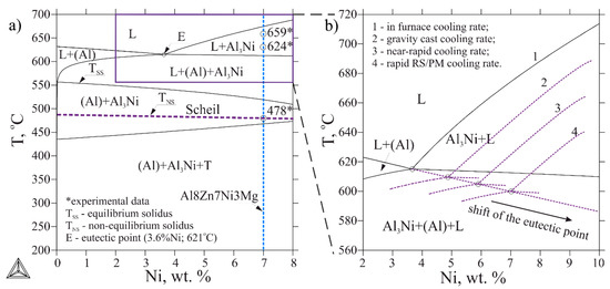(a) Polythermal section of a Al-Zn-Mg-Ni system at 8%Zn and 3%Mg with marked non-equilibrium solidus calculated by Scheil–Goulliver simulation and (b) schematic representation of the solidification path shift as a result of an increase in the cooling rate.