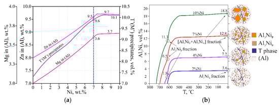 Figure 3a shows how the (Al) solid solution composition evolves at 470 °C depending on nickel content. It is assumed to be the same after rapid solidification. According to the (Al) matrix composition, we simulated its decomposition at the chosen aging temperature of 200 °C as a volume fraction of precipitation products both T’ and M’. The graph shows that nickel addition contributes to a gradual growth of Zn and Mg content in (Al) matrix, as well as precipitates volume, respectively. The solid solution of the experimental Al8Zn7Ni3Mg alloy composes 9.6%Zn and 3.6%Mg, promoting precipitations of 9.6 vol.% both T’ and M’ dispersoids responsible for matrix hardening. It is clearly seen that the (Al) solid solution composition and volume of dispersoids see a plateau (9.7%Zn and 3.7%Mg in (Al) and 10.1 vol.% of precipitates) at over 7.5%Ni. The further addition of nickel may cause an undesirable end of solidification via ternary eutectic [(Al) + Al3Ni + T] leading to the appearance of an additional quantity of the T-phase in the structure undissolved in aluminum. That way, a higher amount of nickel seems to be unreasonable.