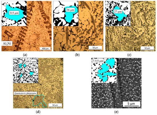 The microstructure of the FC sample (Figure 4a) can be qualified as the nearest to the equilibrium one. During in-furnace solidification, a large fraction of imposingly coarse primary crystals of up to 351 μm can be observed, which are probably responsible for a low ductility of material under such condition. The presented pattern reliably agrees with a schematic one shown in Figure 2b. The primary Al3NiP crystals are in an equilibrium with the eutectic mixture [(Al) + Al3NiE] in which the eutectic-origin particles are relatively small (medium size 12 μm).