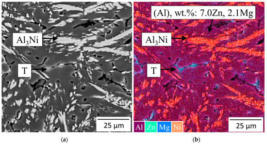 Microstructure of the 5 mm cast sample of the Al8Zn7Ni3Mg alloy: (a) SEM; (b) multilayer elemental map.