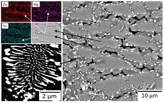 In the microstructure of the 1 mm cast sample (Figure 6), the tough casting condition resulted in the shrinkage cavities formation along the grains. There is no primary phase detected, and the structure seems to be homogeneous and quasi-eutectic in general. As can be seen, the Al3Ni eutectic bands are in the bulk of the (Al) solid solution, and in their vicinities, Zn and Mg rich areas are presented with an Al–8.7%Zn–3.4%Mg composition. This result virtually agrees with a previously calculated (Al) matrix composition at 470 °C and corresponds to a supersaturated condition. The magnified section of the [(Al) + Al3Ni] eutectic band shows that it has a rather fibrous morphology with a linear size of up to 3 μm. These microstructure features exhibit a correspondence to fiber-reinforced metal matrix composites, so it probably yields the best load transfer efficiency.